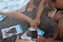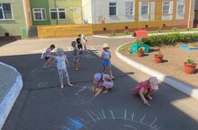 В эти жаркие дни особенно актуальны игры с водой. Детки группы #9 предлагают рисуют на асфальте очень интересным способом. Всё, что нужно - это распылитель и разнообразные шаблоны
