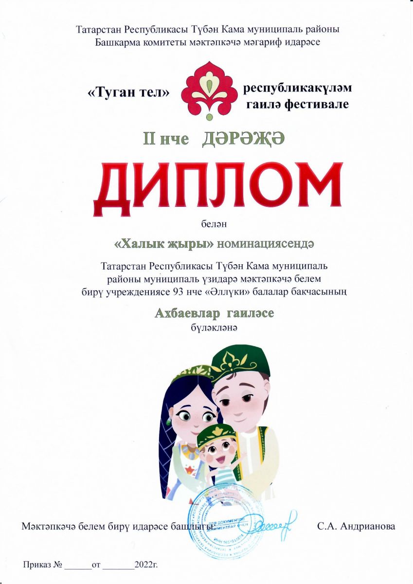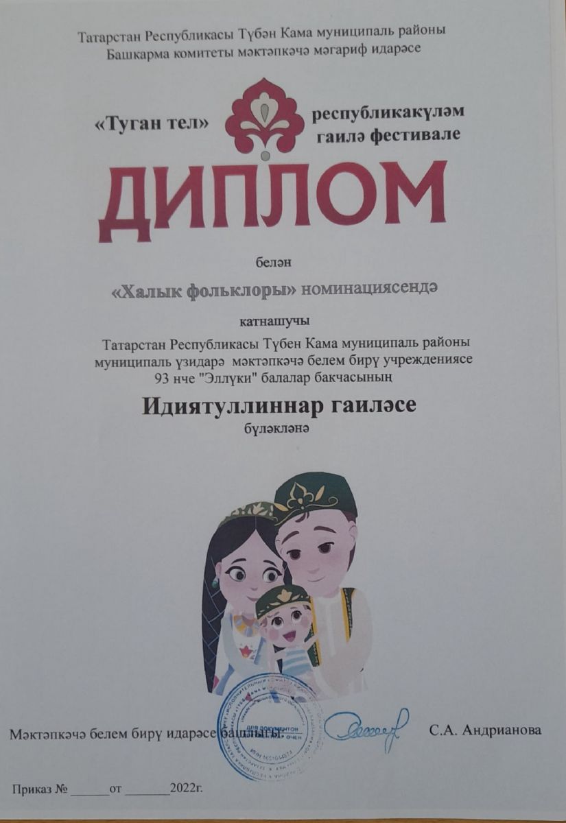 Опубликовано: 06.04.2022В республиканском семейном фестивале "Туган тел", организованном в детском саду № 83 г. Нижнекамска, из нашего детского сада приняли участие семья Ахбаевых и удостоены Диплома 2 степени в номинации "Народная песня", а также семья Идиятуллиных, получила диплом в номинации "Народный фольклор". Цель фестиваля - конкурса: поддержка и развитие традиций семейного творчества, укрепление детско - родительских отношений на основе общих интересов и увлечений.