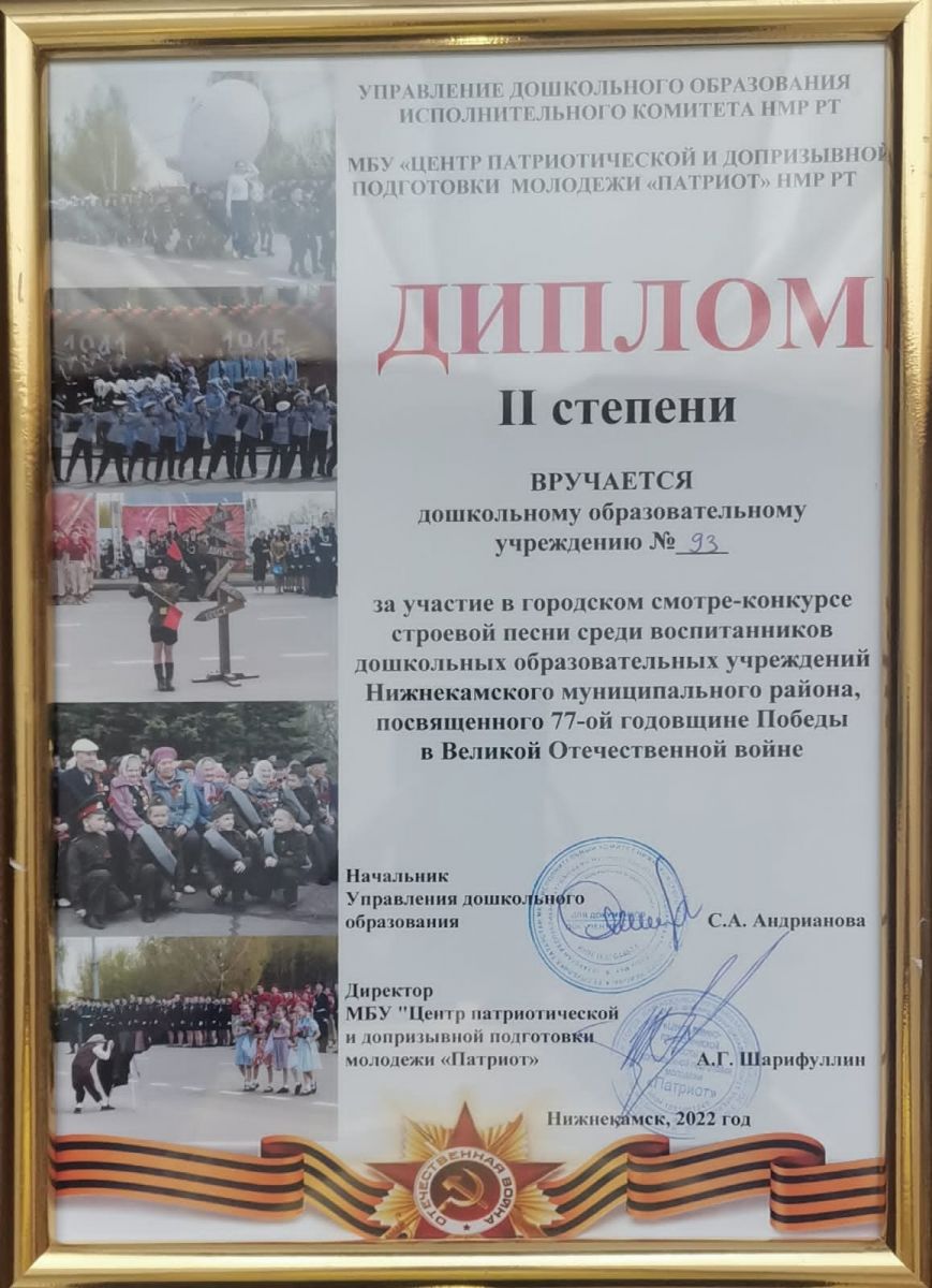 Опубликовано: 29.04.202229.04.2022 года прошёл финал городского смотра-конкурса строевой песни среди воспитанников дошкольных образовательных учреждений города Нижнекамска. Казачий отряд нашего детского сада представляли воспитанники из подготовительных групп. Во время выступления ребята выполняли построения, перестроения, исполняли песню. Достойно выступив, завоевали ДИПЛОМ II СТЕПЕНИ.