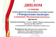 Поздравляем педагогов и детский коллектив с дипломом первой степени в номинации "Музыкальный спектакль". Желаем всем творческих успехов и побед!!!!!