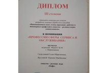 На конкурсе были представлены атрибуты и пособия для сюжетно-ролевой игры "Кафе" и фотографии детей. По результатам конкурса нашим педагогам вручили Диплом III степени в номинации "Профессии сферы сервиса и обслуживания!.