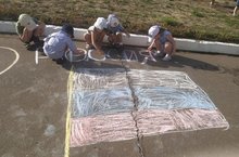 по станциям и проходить разные задания. По успешному прохождению всех заданий- команда нашла заветный флаг России. В ходе игры дети проходили этапы, выполняя задания, искали цвета флага. Детям рассказали о истории государственных символов России, о значении каждого цвета флага. Прошла викторина "Символ России". Ребята отвечали на вопросы о государственной символике, о культуре и истории России, затем все дети разноцветными мелками нарисовали на асфальте огромный флаг России.
