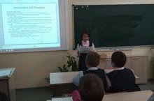 На классном часе ученики 5 д класса с увлечением слушают выступление своих одноклассников, которые подготовили информацию на тему "Известные люди Нижнекамска".