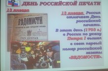 13 января библиотекарем нашей школы Латышевой Ларисой Геннадьевной было проведено внеклассное мероприятие, посвященное Дню российской печати! В ходе беседы ребята узнали много нового и интересного, например, что именно в этот день в 1703 году в Москве вышла первая газета "Ведомости о военных и иных делах, достойных знания и памяти, случившихся в Московском государстве и во иных окрестных странах". Это дата считается началом истории русской печати. На данный момент в Российской Федерации зарегестрировано более 40 тысяч газет и еженедельников. По окончании, ребята поблагодарили Ларису Геннадьевну за подготовленный для них материал!