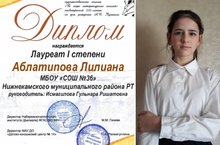 Аблатипова Лилиана ученица 6а класса приняла участие в Республиканском конкурсе художественного чтения "В мире литературных мыслей",посвященный 220-летию со дня рождения А.С.Пушкина, заняв 1 место. Мы гордимся успехами Лилианы,умничка!