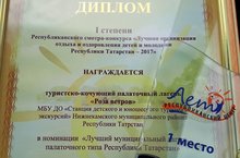 Станция детского и юношеского туризма и экскурсий НМР РТ в Республиканском смотре - конкурсе "Лучшая организация отдыха и оздоровления детей и молодежи - 2017" удостоена дипломом I степени в номинации "Лучший муниципальный лагерь палаточного типа Республики Татарстан". Поздравляем! Молодцы!