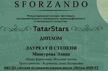 От души поздравляем победителей Международного конкурса «Зимняя фантазия» проекта «Музыкальный Звездный Олимп» Диплом Лауреата I степени получила Мансурова Элина,преподаватель: Журавлева Диана Валерьевка Номинация: Инструментальный жанр. Фортепиано, Диплом Лауреата II степени -Шумилова Мария, диплом Лауреата III степени- Разетдинова Камиля, преподаватель Ахмедова Гульсина Миннехановна, поздравляем воспитанников и преподавателей с победой