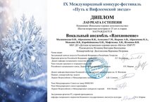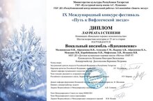 21.01.24 в Казани при поддержке Министерства культуры РТ, Культурного центра имени А.С. Пушкина,РЦВР Art-association «Зажечь звезду» прошел IX Международный конкурс-фестиваль «Путь к Вифлеемской звезде» и наш вокальный ансамбль преподавателей « Вдохновение» получил ДИПЛОМ ЛАУРЕАТА І СТЕПЕНИ Номинация «Вокально-хоровое исполнительство» Шестая возрастная категория от 25 лет и старше (Вокальный ансамбль «Вдохновение» Малиновская О.Н., Абросимова Н.Я., Ахмедова Г.М., Нырова А.В., Абросимова К.А., Меньших В.В., Коробейникова О.Н., Мифтяхова Л.И., Игошина В.В. Руководитель Игошина Виктория Васильевна Концертмейстер Долгополова Вероника Петровна) От души поздравляем творческих преподавателей !!!