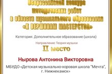 От души поздравляем нашего преподавателя Нырову Антонину Викторовну, победившую во Всероссийском конкурсе методических работ в области музыкального образования « К Вершинам мастерства»,посвященного Году педагога и наставника. Поздравляем со званием лауреата! Желаем дальнейших профессиональных достижений!