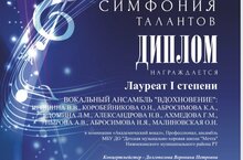 От души поздравляем вокальный ансамбль преподавателей "Вдохновение". Наши преподаватели стали Лауреатами I степени в Международном конкурсе искусств "Симфония талантов".В этом конкурсе приняли участие конкурсанты из разных городов России.Поздравляем с прекрасным результатом!