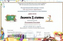 Поздравляем преподавателя по вокалу Ахмедову Г. М и ее воспитанниц - Лукошину Е. и Сафиуллину М. С победой в Республиканском конкурсе чтецов «По школьным страницам»,посвященного Году педагога и наставника. Девочки стали Лауреатами II степени.