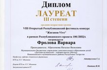 Пришли результаты VIII Открытого Республиканского фестиваля-конкурса «Жиганов-Vivo».Лебедева Дарья и Фролова Варвара стали лауреатами III степени, Усманова Элина- дипломантом.Поздравляем девочек и их преподавателя ,по классу фортепиано, Абросимову Наталью Яковлевну с прекрасным результатом. Потрясающее жюри и большая конкуренция! Спасибо Вам за любовь к музыке!