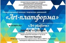 Радуемся успехам своих воспитанников. Международный конкурс творческих дарований “Art-platform” Лауреат II степени-Фролова Варвара, преподаватель Абросимова Наталья Яковлевна ( номинация « Инструментальное исполнительство») Благодарственным письмом отмечена преподаватель Абросимова Н.Я за прекрасную подготовку ученицы Молодцы! Гордимся!