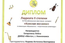 Поздравляем Гатауллину Лейлу-победительницу XV Республиканского фестиваля-конкурса « Камская мозаика», в номинации " Музыкально- теоретическая олимпиада", Лейла стала Лауреатом II степени,преподаватель Антонина Викторовна Нырова! Так держать, гордимся!