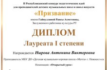 От души поздравляем преподавателя Нырову Антонину Викторовну , ставшую Лауреатом I степени , во II Республиканском конкурсе педагогических идей для преподавателей детских музыкальных школ и школ искусств « Призвание», им. Гайнуллиной Р.А., в номинации « Открытый урок», работа Антонины Викторовны была высоко оценена членами жюри. Поздравляем и гордимся!