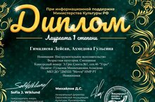 От души поздравляем преподавателя Ахмедову Гульсину Миннехановну, ставшую Лауреатом I степени в номинации «Академический вокал», концертмейстер Нырова Антонина Викторовна , в Международном конкурсе-фестивале « Малахитовый Узор», а также воспитанников Ахмедовой Г.М по классу фортепиано: Тихонову Милану- лауреат I степени, Гимадиеву Лейсан и преподавателя Ахмедову Г . М. -лауреаты I степени,Романову Арину и Сафиуллину Марину, ставших лауреатами II степени, в номинации «Иструментальное исполнительство» Поздравляем и гордимся!