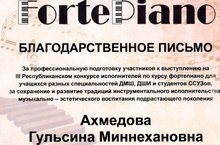 Пришли ещё результаты III Республиканского конкурса исполнителей по курсу фортепиано для учащихся разных специальностей ДМШ, ДШИ и студентов ССУЗов « FortePiano», конкурс проходил в Камских Полянах, от души поздравляем Разетдинову Рузилю - диплом Лауреата II степени,Шумилову Марию ,Гимадиеву Лейсан-Дипломанты I степени, Романову Арину-Дипломант II степени,Тихонову Милану - Дипломант III степени и преподавателя по фортепиано Ахмедову Гульсину Миннехановну. Была сильнейшая конкуренция, конкурсанты были из Казани, из Набережных Челнов. Наши воспитанники показали хороший результат.Гордимся и поздравляем.Конкурс проходил очно.