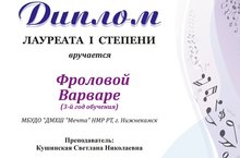 Подведены итоги конкурса Международной олимпиады по «Слушанию музыки» «Музыкальный калейдоскоп» по теме "К.Сен-Санс "Карнавал животных"". Лауреата 1 степени удостоилась Фролова Варвара, также была отмечена благодарственным письмом преподаватель Кушинская Светлана Николаевна, которая подготовила воспитанницу .