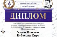 От души поздравляем Сафину Альбину Накиповну и ее ученицу Кубасову Киру с победой в Республиканском конкурсе юных музыкантов им.Ф. Яруллина в номинации "Общее фортепиано". Кира стала Лауреатом II степени.Гордимся !