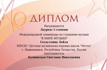 Лауреатом I степени в Международной олимпиаде по слушанию музыки «В мире музыки»стала воспитанница нашей школы Гатауллина Лейла. Поздравляем педагога Кушинскую Светлану Николаевну за хорошую подготовку воспитанницы!Гордимся! Во Всероссийском конкурсе «Мелодинка.Олимпиады и публикации» сам педагог Кушинская С.Н. Стала победителем! Поздравляем!