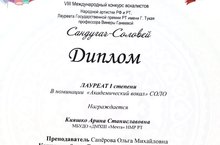 Завершился VIII Международный конкурс вокалистов, народной артистки РФ и РТ, лауреата Госпремии РТ им.Г.Тукая, профессора Винеры Ганеевой « Сандугач-Соловей» .Мы от души поздравляем и гордимся успехами нашей воспитанницы Кияшко Арины, преподаватель по вокалу Саперова Ольга Михайловна, концертмейстер Талапина Екатерина Дмитриевна, с заслуженной победой. Она -Лауреат I степени.