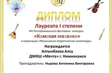 Сегодня пришли результаты конкурса! Наши ученики - большие Молодцы! В XIV Республиканском фестивале-конкурсе "Камская мозаика" в номинации "Музыкально-теоретическая олимпиада" ( г.Чистополь): все четвероклассники стали Лауреатами I степени :Гилаев Акмаль, Габдуллина Лилия и Файзрахманова Самира, преподаватель Азизова Викторина Исмаиловна, Никитина Виктория , преподаватель Нырова Антонина Викторовна и 5 кл Алтынбаева Алсу ( Нырова А. В.)Гордимся и поздравляем!