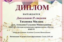 Поздравляем Тихонову Милану и преподавателя по фортепиано Ахмедову Гульсину Миннехановну с победой во Всероссийском конкурсе юных музыкантов «Нескучная классика в содружестве муз» (Казань, 2021)!