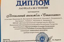 Пришли результаты I Республиканского конкурса вокализов «VOCALIZZO»/Во II младшая возрастная группа участвовали- Сафиуллина Марина и она стала Лауреатом III степени, и Григорьева Татьяна –дипломантом III степени, преподаватель по классу вокала Ахмедова Гульсина Миннехановна. Поздравляем и гордимся талантами!