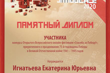 Памятный диплом получила Игнатьева Екатерина, преподаватель Саперова О.М, участница Открытого Всероссийского онлайн-фестиваля "Спасибо за Победу"