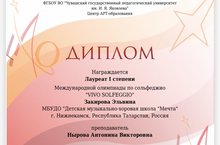 Лауреатом I степени в международной олимпиаде по сольфеджио "Vivo solfeggo" стала воспитанница нашей школы Закирова Эльвина . В олимпиаде приняло участие 567 человек ,из разных городов и стран Ближнего и Дальнего Зарубежья. Поздравляем педагога Нырову Антонину Викторовну за отличную подготовку воспитанницы.Гордимся!