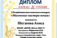 лауреата 2 степени - Шегапову Анису (класс преподавателя Кирилловой К.П., концертмейстер Андреева В.П.),