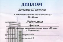 15 мая 2015 года обучающаяся ДМХШ "Мечта" Набиуллина Диляра заняла III место в IX Международном фестивале-конкурсе молодых исполнителей "Челны собирают друзей" (руководитель - Саперова Ольга Михайловна, концертмейстер - Яковлева Нэлли Валентиновна).