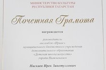 Поздравляем Ирека Зинетулловича Наскаева, Заслуженного работника культуры РТ, преподавателя хореографии с получением Почетной грамоты Министерства культуры Республики Татарстан за активное участие в организации и проведении Федерального Сабантуя в г. Астрахань.