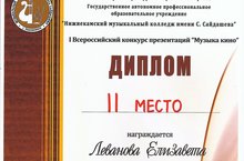 27 февраля в Нижнекамском музыкальном колледже имени Салиха Сайдашева прошел I Всероссийский конкурс презентаций «Музыка кино», где Леванова Елизавета ученица 6 класса заняла 2 место, руководитель Праздникова Анна Николаевна. Поздравляем!!!