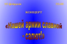 19 февраля в актовом зале МБУ ДО "Детская школа искусств" в 15.00 состоится концерт посвященный, Дню защитника Отечества - "Нашей армии славной - салют!".