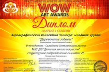 Поздравляем хореографический коллектив "Аллегро" под руководством Силайкиной Светланы Николаевны с еще одной победой на Международном конкурсе - фестивале "WOW ART AWARDS". Мы желаем удачи коллективу и дальнейших творческих побед!