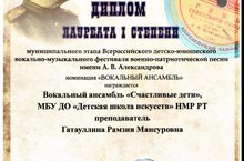 Поздравляем вокальный ансамбль "Счастливые дети" #структуранабазегимназии 1 (преподаватель Гатауллина Р.М.) с очередной победой! Они стали обладателями диплома лауреата l степени муниципального этапа Всероссийского детско-юношеского вокально-музыкального фестиваля военно-патриотической песни имени А.В. Александрова.