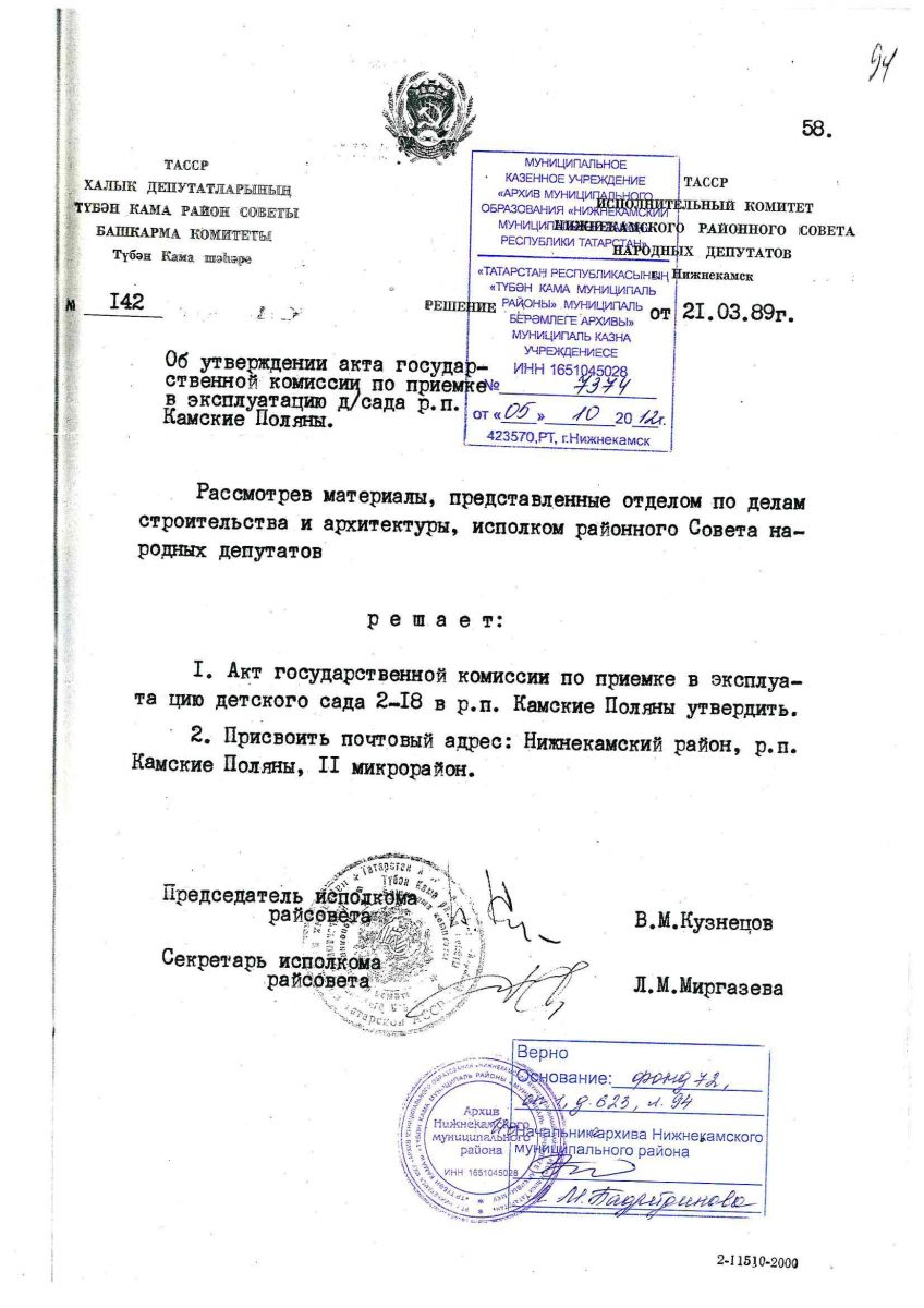 - Решение об утверждении акта государственной комиссии по приемке в эксплуатацию