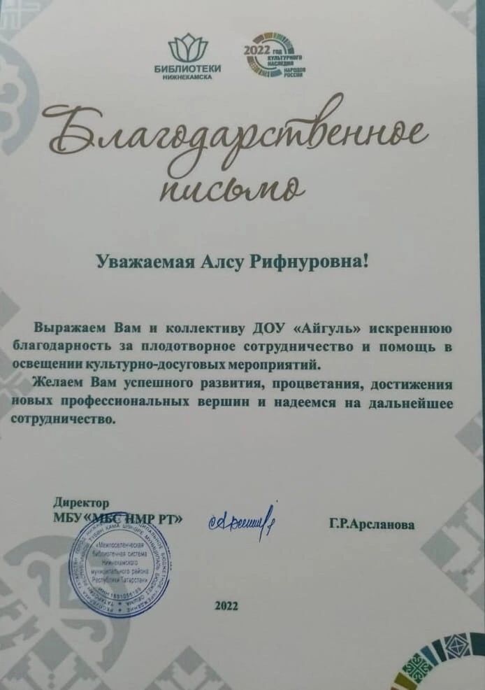 На Фестивале «Библиотека без границ», который прошёл в Камских Полянах 16 июня, наш детский сад «Айгуль»поощрили благодарственным и письмом и книгой «Татарский костюм». Спасибо организаторам за интересное мероприятие, за приглашение, за внимание.
