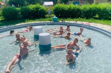 Дети играют с водой и с удовольствием купаются в уличном бассейне.