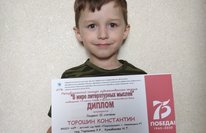 Диплом лауреата II степени Республиканского конкурса художественного чтения "В мире литературных мыслей", получил Торошин Константин. Подготовили ребёнка: Кужабекова Н. Т. и Торошина Р. Р.