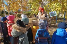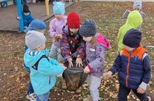 Мы начинаем уборку осенних листьев. Ребята с большим желанием помогают