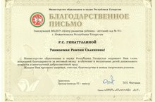 Заведующий МБДОУ "ЦРР - детский сад №91" Гинатуллина Рамзия Салиховна была награждена благодарственным письмом Министерства образования и науки Республики Татарстан за весомый вклад в обучение и воспитание детей дошкольного возраста и моголетний добросовестный труд.