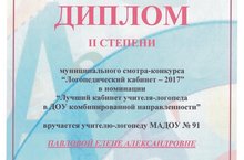 С 13 по 17 ноября прошел конкурс логопедических кабинетов среди дошкольных образовательных учреждений города Нижнекамск. В конкурсе приняли участие 35 кабинетов. 7 декабря были подведены итоги конкурса. Учитель-логопед «Центр развития ребёнка – детский сад № 91» Павлова Е.А. была награждена Дипломом 2 степени.
