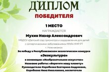 Наши воспитанники старшей группы Алчинова А. и Мухин Н. были удостоены Дипломами 1 место в Республиканском экологическом конкурсе "Экокультура" в номинации Изобразительное искусство.