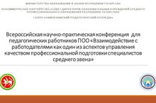 18 февраля 2022 года на базе ГАПОУ «Нижнекамский педагогический колледж» состоялась Всероссийская научно-практическая конференция для педагогических работников ПОО «Взаимодействие с работодателями как один из аспектов управления качеством профессиональной подготовки специалистов среднего звена».