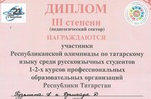 Поздравляем студентов Кузнецову Алену, Кучмайда Диану и их руководителя Галимову Файрузу Аксановну с победой Республиканской олимпиаде по татарскому языку среди русскоязычных студентов 1-2-х курсов профессиональных образовательных организаций Республики Татарстан. Желаем дальнейших успехов и новых побед!