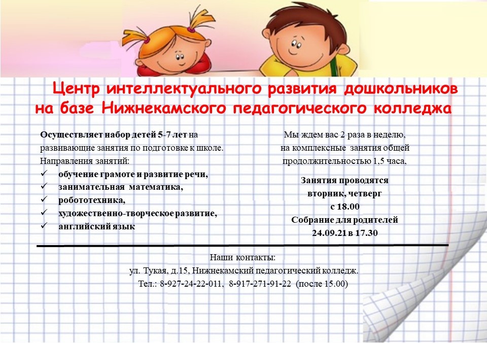 Центр интеллектуального развития дошкольников на базе Нижнекамского педагогического колледжа открывает набор!!!