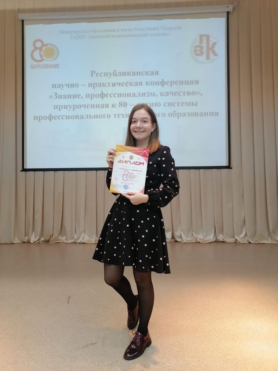 Опубликовано: 23.10.2020Поздравляем Буранкову Ирину и ее руководителя Сибгатову Венеру Данифовну с победой в номинации “Креативное выступление” на Республиканской научно-практической конференции “Знание, профессионализм, качество”, приуроченной к 80-летию системы профессионального технического образования.