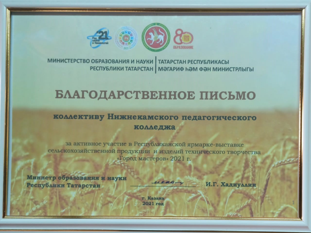 Так же директора нашего колледжа Астадурян Разину Миннахметовну наградил министр образования и науки Республики Татарстан Хадиуллин Ильсур Гараевич благодарственным письмом за активное участие в Республиканской ярмарке-выставке сельскогохозяйственной продукции и изделий технического творчества.